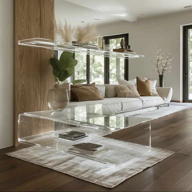 The magic of glass and acrylic is their see-through quality. A floating acrylic shelf looks like it’s suspended in air, showing off objects without blocking views. This is great for small spaces or for highlighting a special object like a vase or sculpture. Glass can also be used as tops for floating tables, combining the airy feel with a sturdy surface. Carefully chosen clear furniture makes living rooms feel less crowded and more refined.