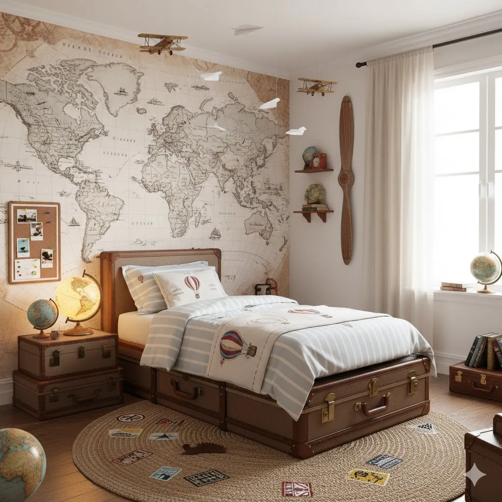A travel adventure theme inspires kids to dream big and explore the world. It’s perfect for children who love maps, airplanes, or learning about new places. This theme encourages curiosity and imagination, turning their room into a mini travel hub.