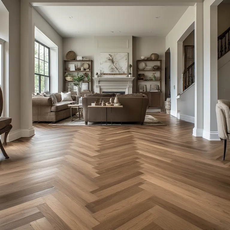 Herringbone hardwood floors bring timeless elegance with a modern twist. The zigzag pattern adds visual interest and luxury to living rooms. This pattern works with classic or contemporary furniture and instantly elevates the room’s style. Herringbone floors also give a sense of depth and dimension, making spaces feel larger and more sophisticated.