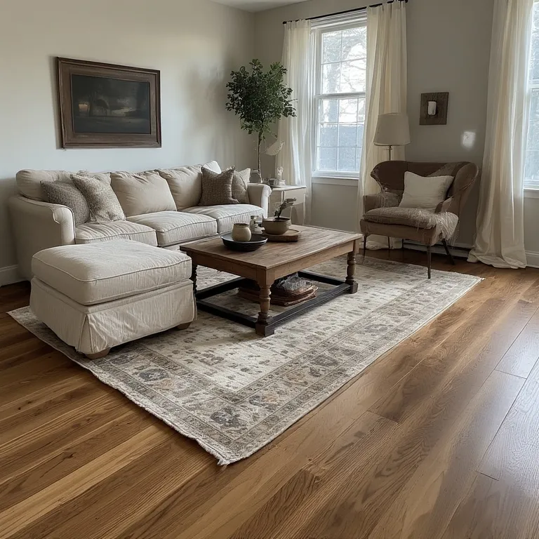 Honey oak floors are warm and inviting, giving living rooms a classic and cozy vibe. The golden-brown tone works well with neutral walls, soft furniture, and rich rugs. Honey oak is timeless and continues to be a favorite choice for families who want a welcoming and versatile living space.