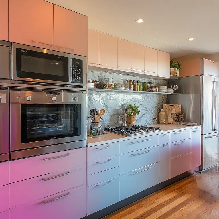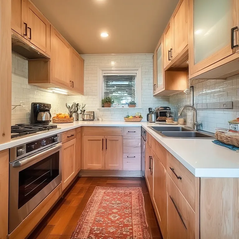 Use vertical storage, built-in appliances, and light colors. Mirrors or glossy surfaces can also help reflect light and make the space feel bigger.