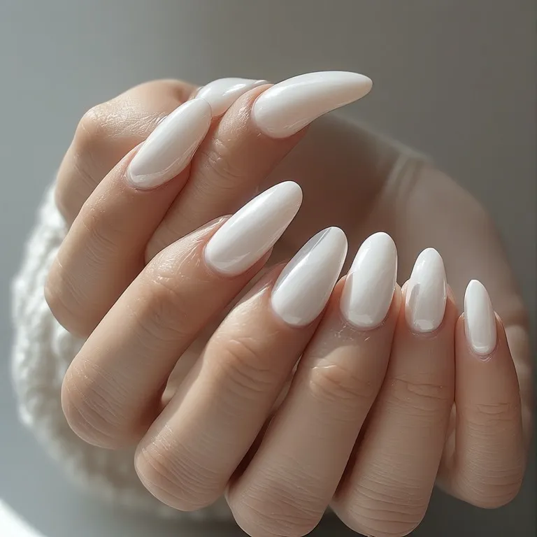 A clean white manicure on coffin nails creates a bright and stylish look perfect for spring.