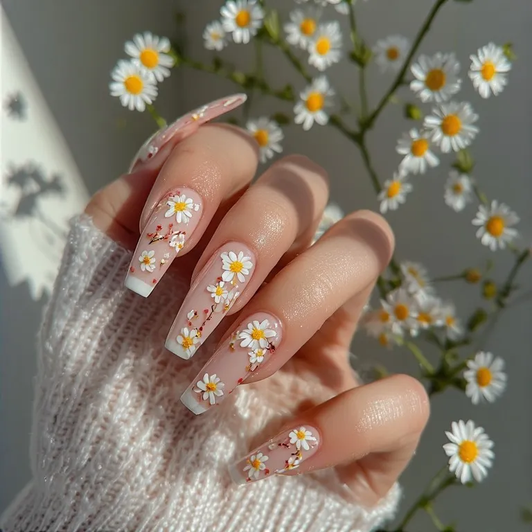 Spring and flowers go hand in hand. Adding tiny floral designs to coffin nails creates a beautiful seasonal look.