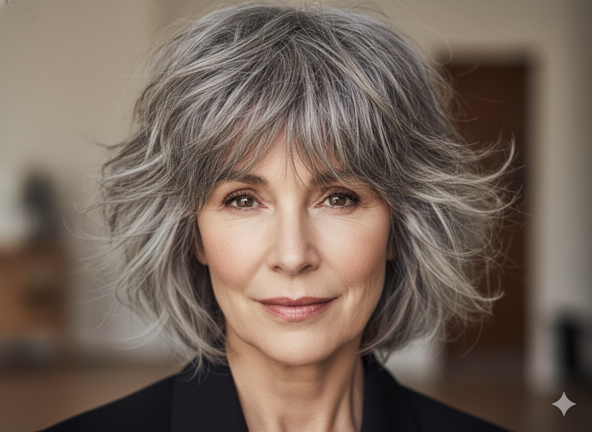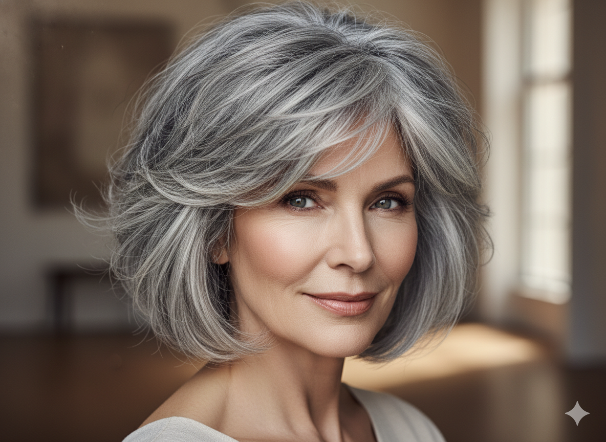 Feathered layers create a light, airy feel. This hairstyle adds softness around the face and works especially well with natural gray or silver hair.