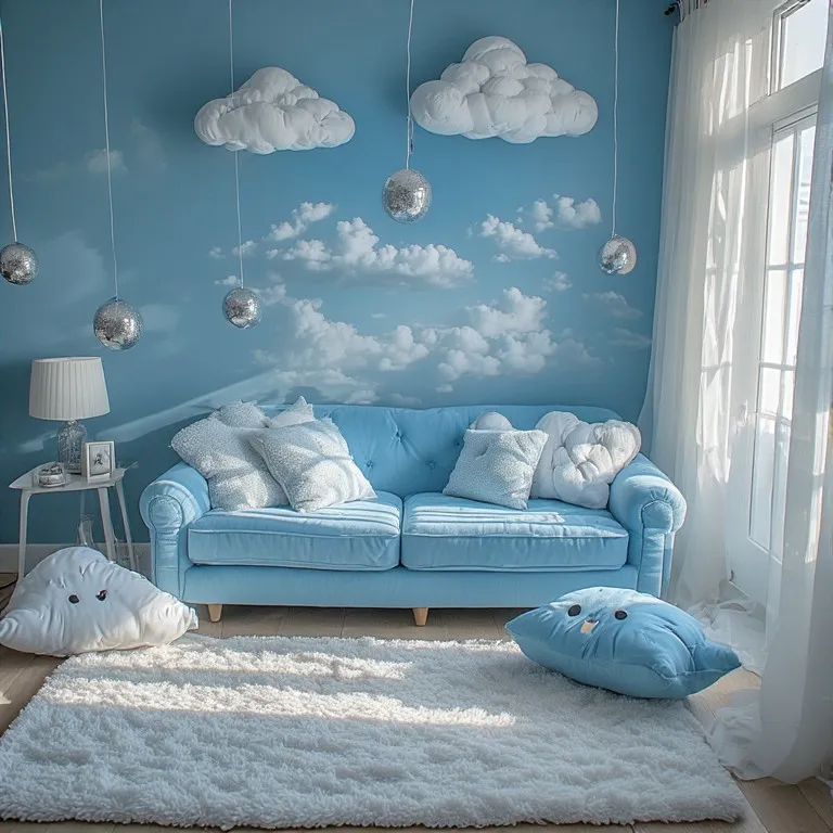 Add cloud-shaped pillows or soft white rugs. Wall art with sky scenes works beautifully. It feels peaceful, like floating in the air.