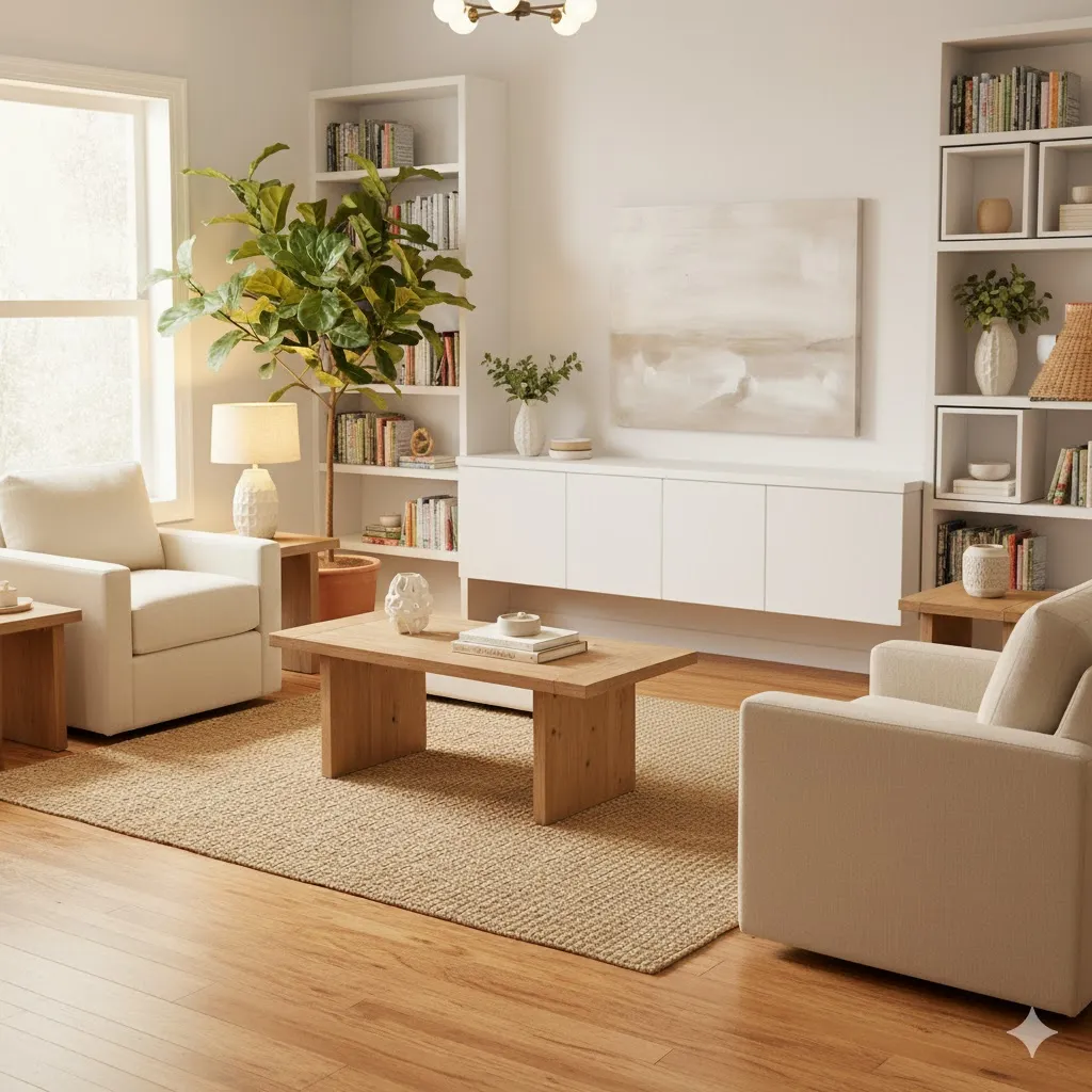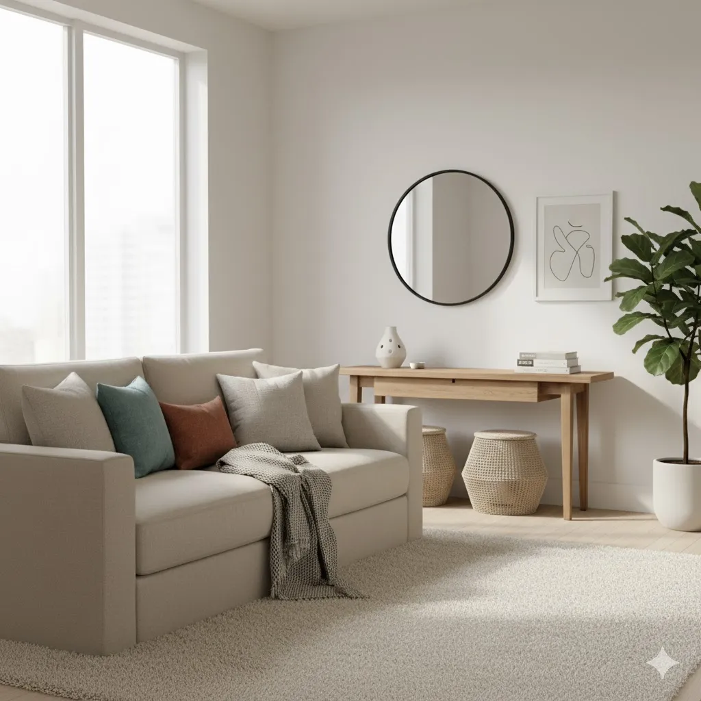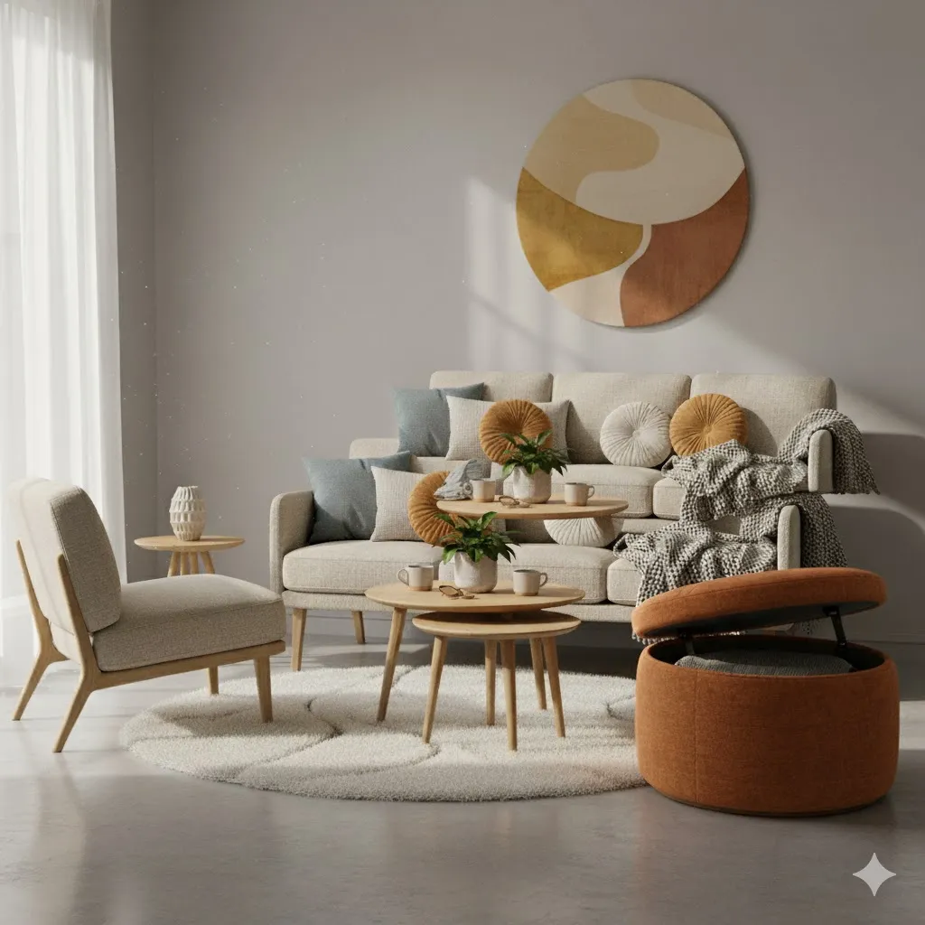Small rooms need shape-shifters. Two stacking stools live under the console and pop out for guests. Poufs slide under the coffee table and become feet-up comfort or side seating. A folding side table hides behind the sofa and appears for game night. Choose neutral, durable fabrics so these helpers blend in. The rule: if a piece can do two jobs or disappear when not needed, it earns its place.