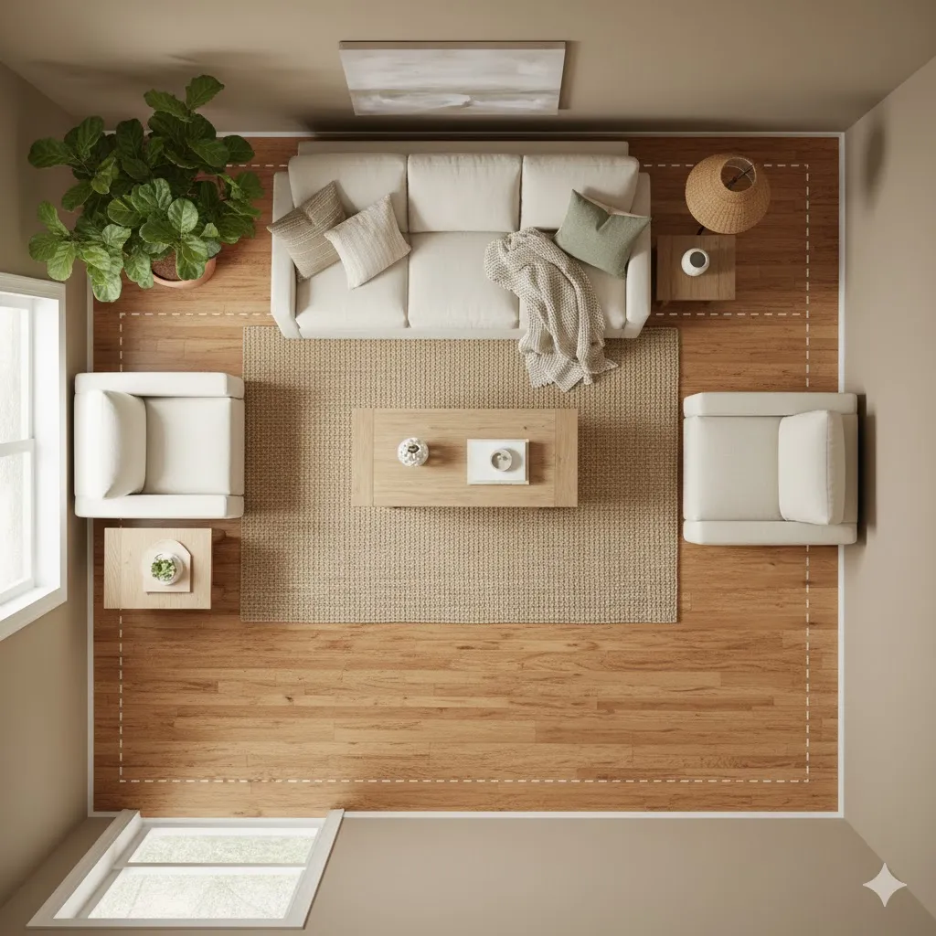 Rectangular rugs anchor classic layouts; round rugs soften narrow rooms and ease traffic around corners. Whichever you choose, get it large enough for the front legs of seating to sit on it.