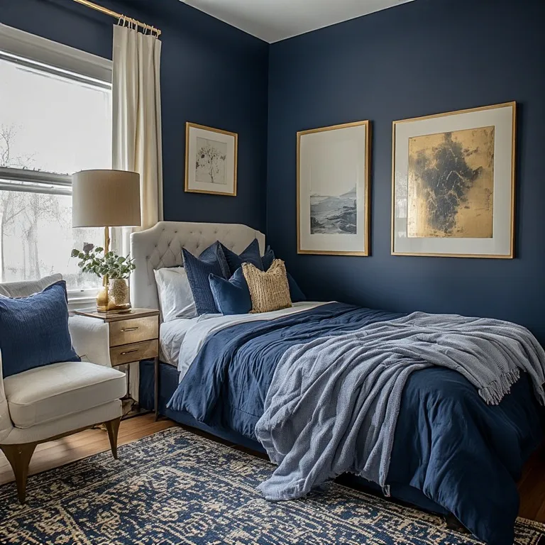 Navy blue and gold is bold and classy. Navy walls make a strong statement. Gold details add shine and glam.