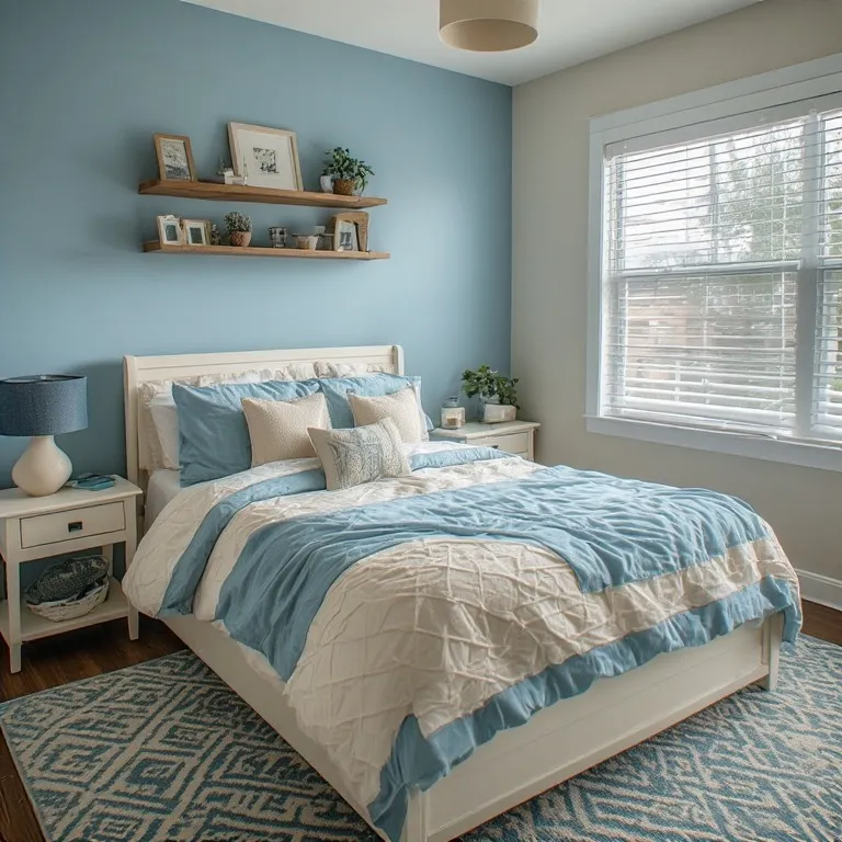 Choose cream or white furniture to keep things balanced. Add light wood shelves for extra warmth. Soft blue bedding with cream pillows will tie the whole room together beautifully.