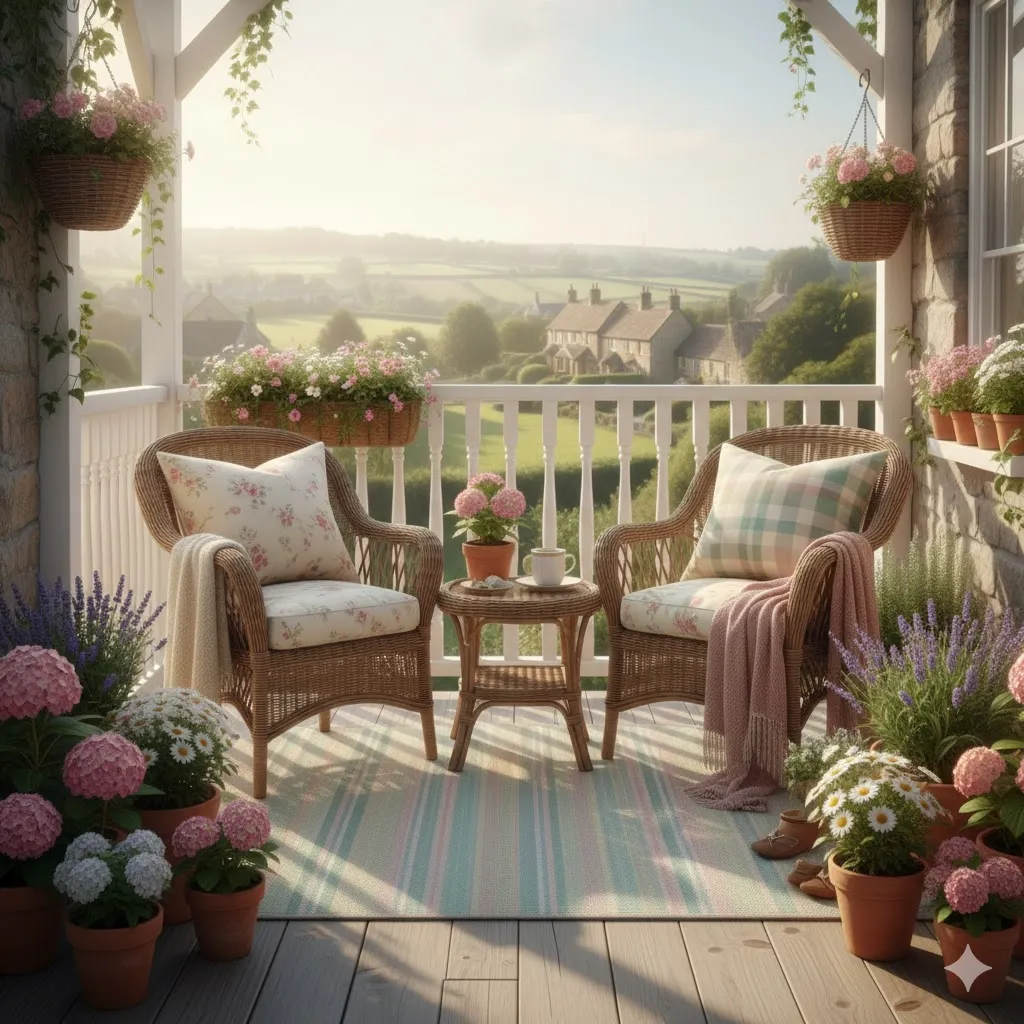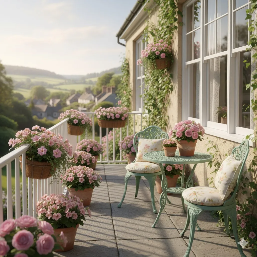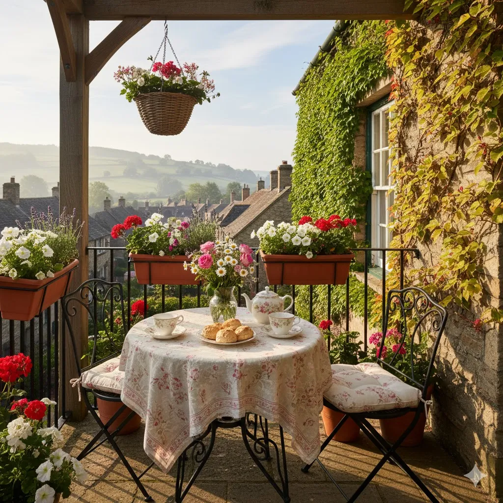 English balcony decor focuses on elegance, softness, and a connection to nature — with flowers, pastels, and vintage details.