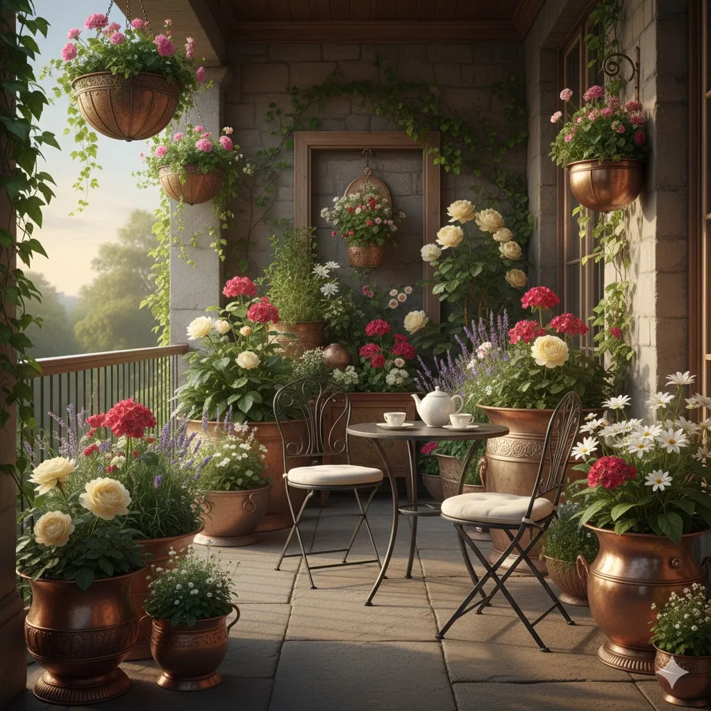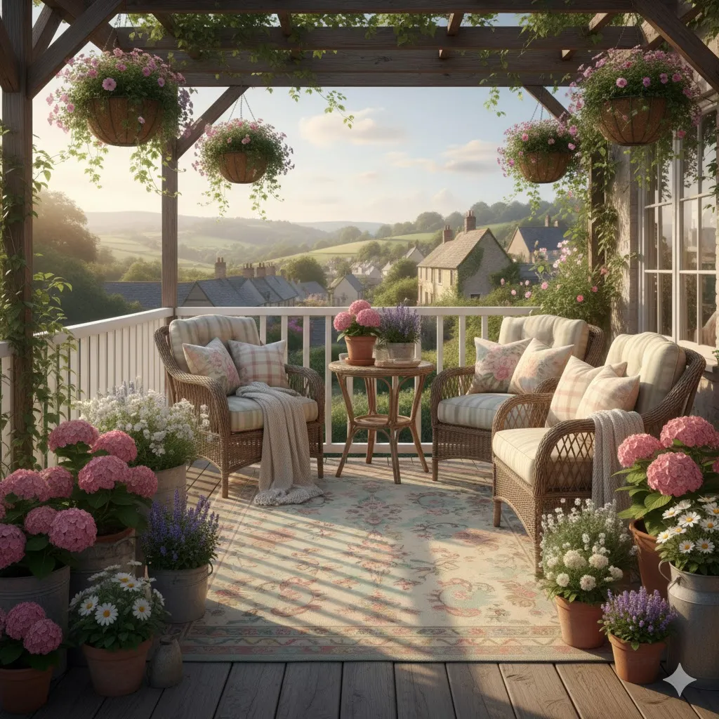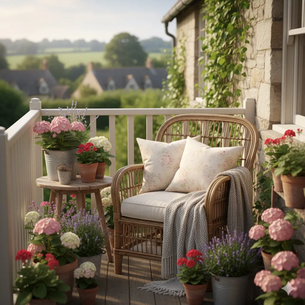 English balcony decor focuses on elegance, softness, and a connection to nature — with flowers, pastels, and vintage details.