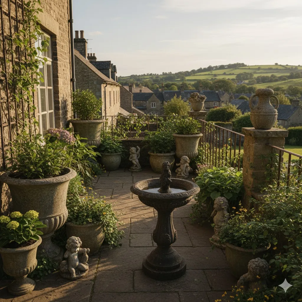 Weathered stone statues, birdbaths, or small fountains can add a beautiful antique touch. These details remind you of classic English gardens filled with history and romance. You don’t need big pieces — even a small stone planter or sculpture can make a difference. The natural aging of stone brings authenticity and depth, blending beautifully with plants and flowers.