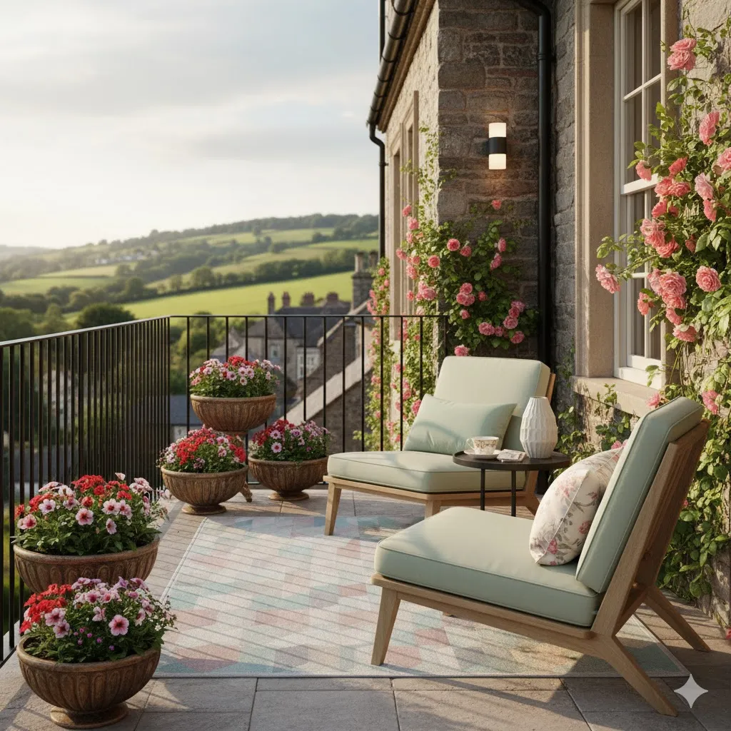 Soft furnishings are the secret to making your balcony inviting. Choose cushions and throws in floral prints, checks, or soft solids. Cotton and linen fabrics in gentle tones like ivory, sky blue, or blush pink bring the perfect English look. These little details make your space comfortable, personal, and full of charm. You can easily switch them seasonally for a fresh feel.
