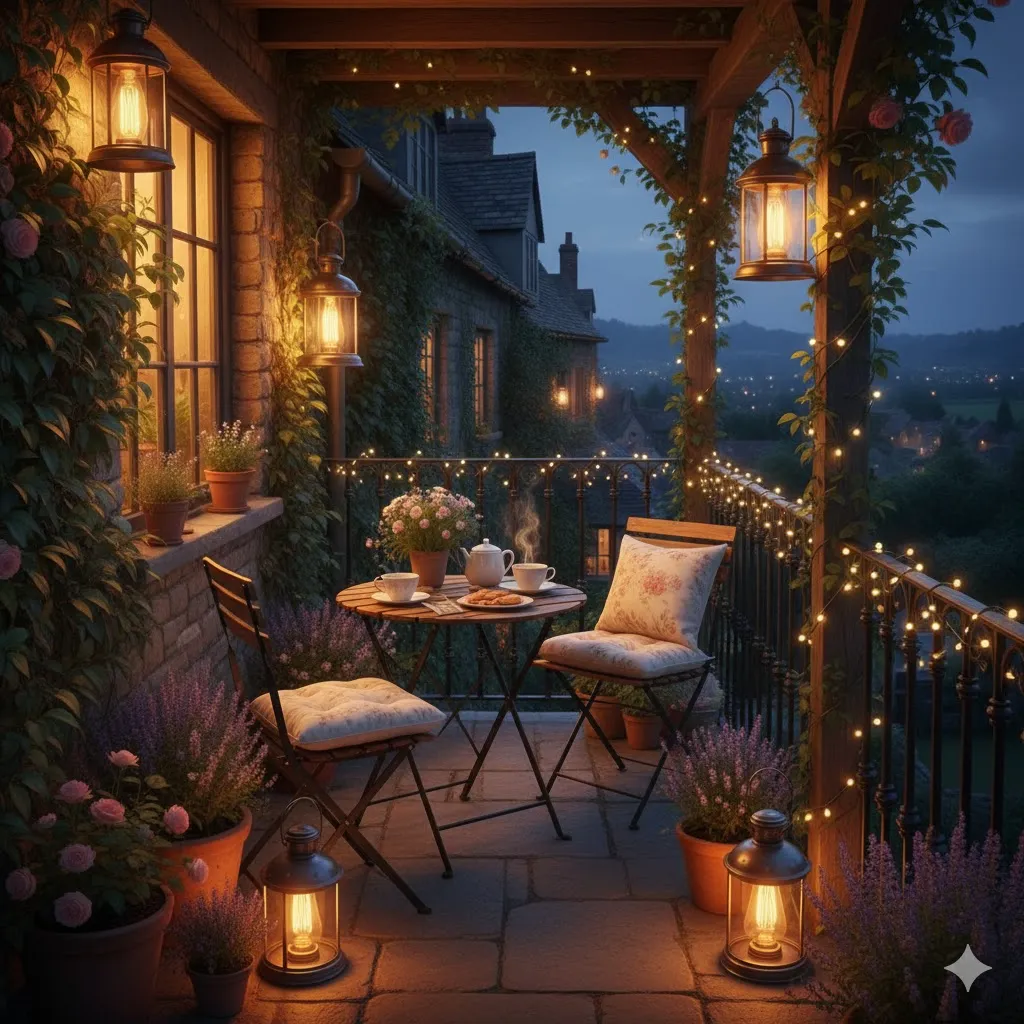 Lighting transforms your balcony, especially in the evenings. Cottage-style lanterns, fairy lights, or vintage sconces create a magical glow. Warm yellow or golden light adds coziness and highlights your decor beautifully. Hang string lights along the railing or place a few candle lanterns on the floor for that romantic English charm. It’s all about creating a peaceful, inviting space you’ll love spending time in.
