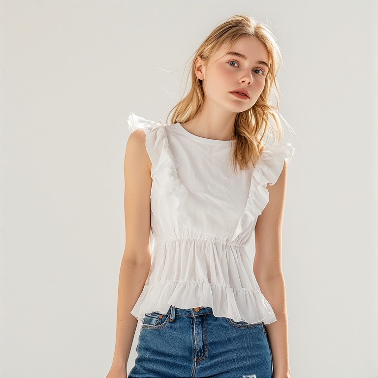 The white ruffle top is a timeless piece. It looks clean, fresh, and stylish. You can pair it with almost anything, from jeans to skirts. It is like the little black dress but for summer.