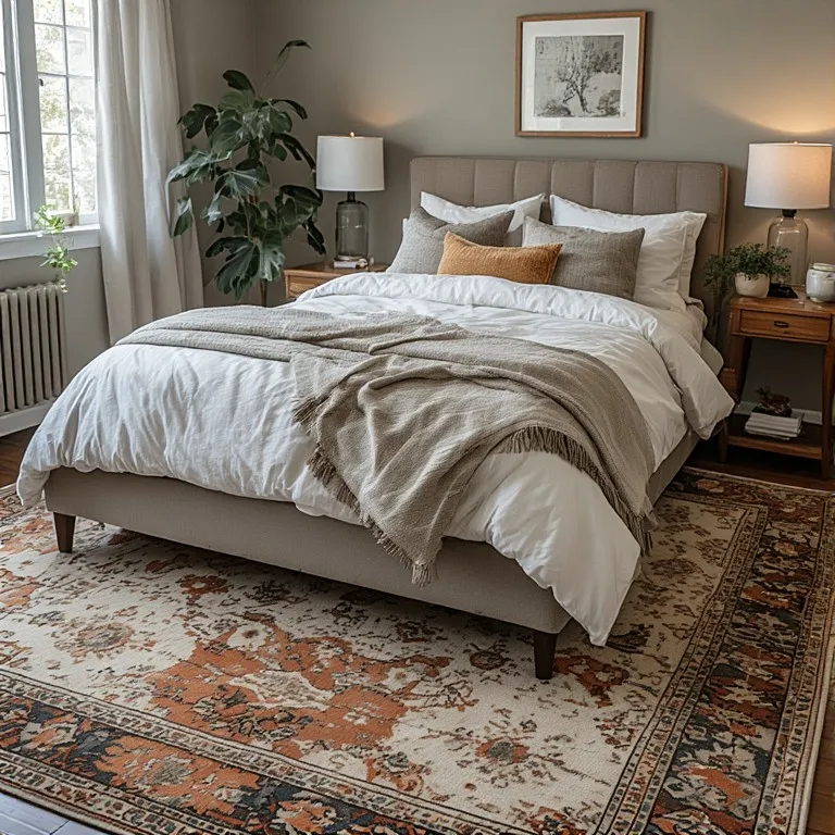 Imagine a clean white room with simple furniture. Now add a colorful Persian-style rug. Suddenly, the room feels warm and full of life.