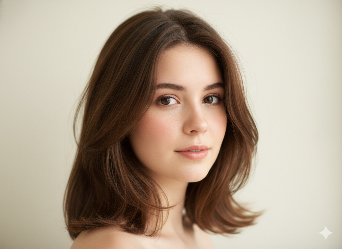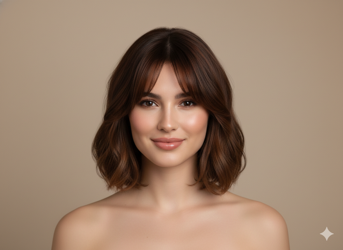 Feathered ends create softness and movement without adding width, making it flattering for round faces.