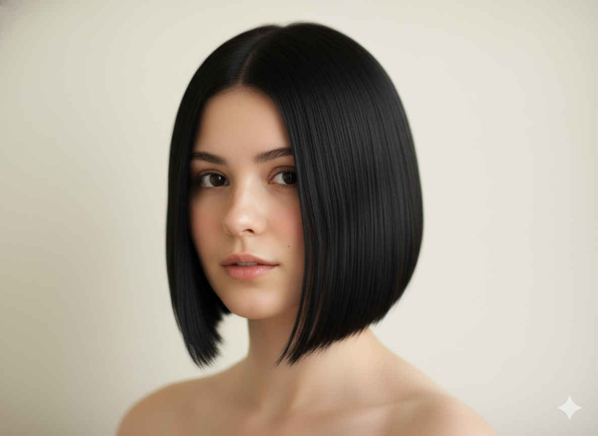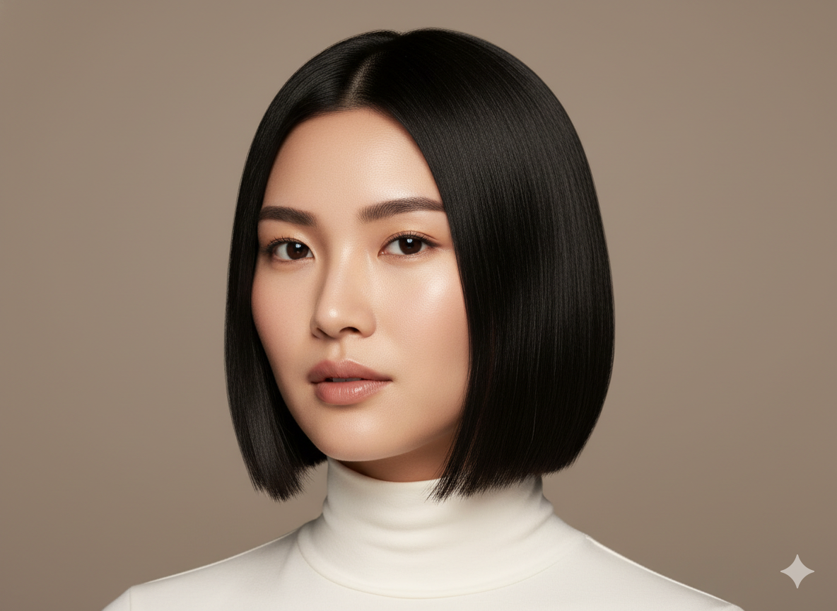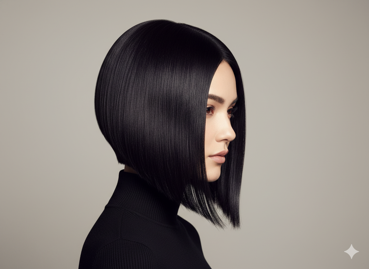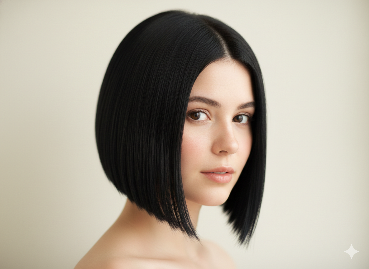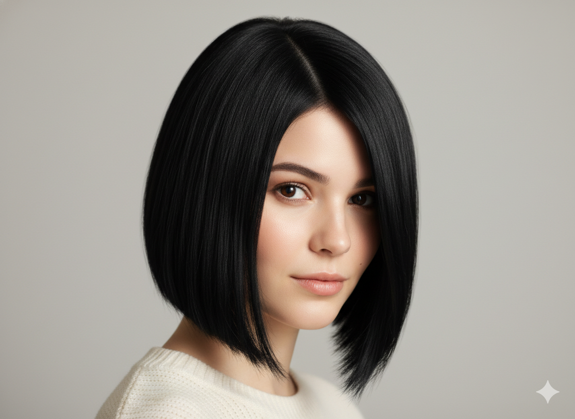 An angled bob is shorter at the back and longer at the front. This shape naturally draws the eye downward, making the face appear slimmer and more defined.