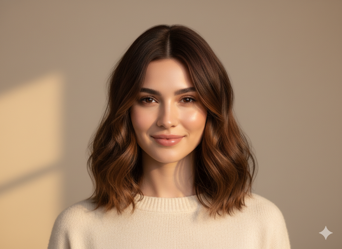 A long layered bob is one of the most flattering choices for round faces. The extra length helps elongate the face, while subtle layers add movement without creating bulk.
