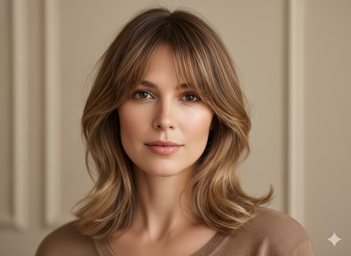 Wispy bangs soften the forehead area, while highlights add depth to the overall hairstyle.