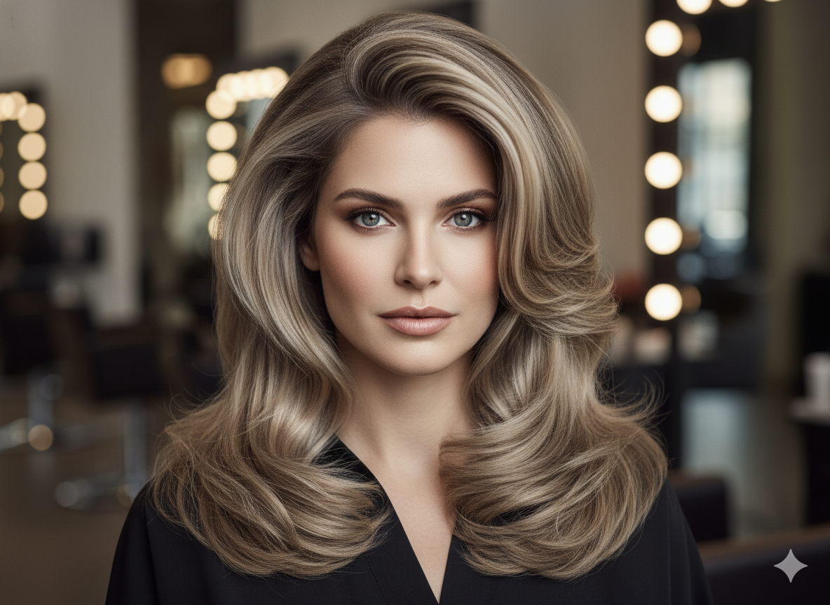A blowout style with soft highlights gives a salon-fresh, glamorous finish that works well for special occasions.