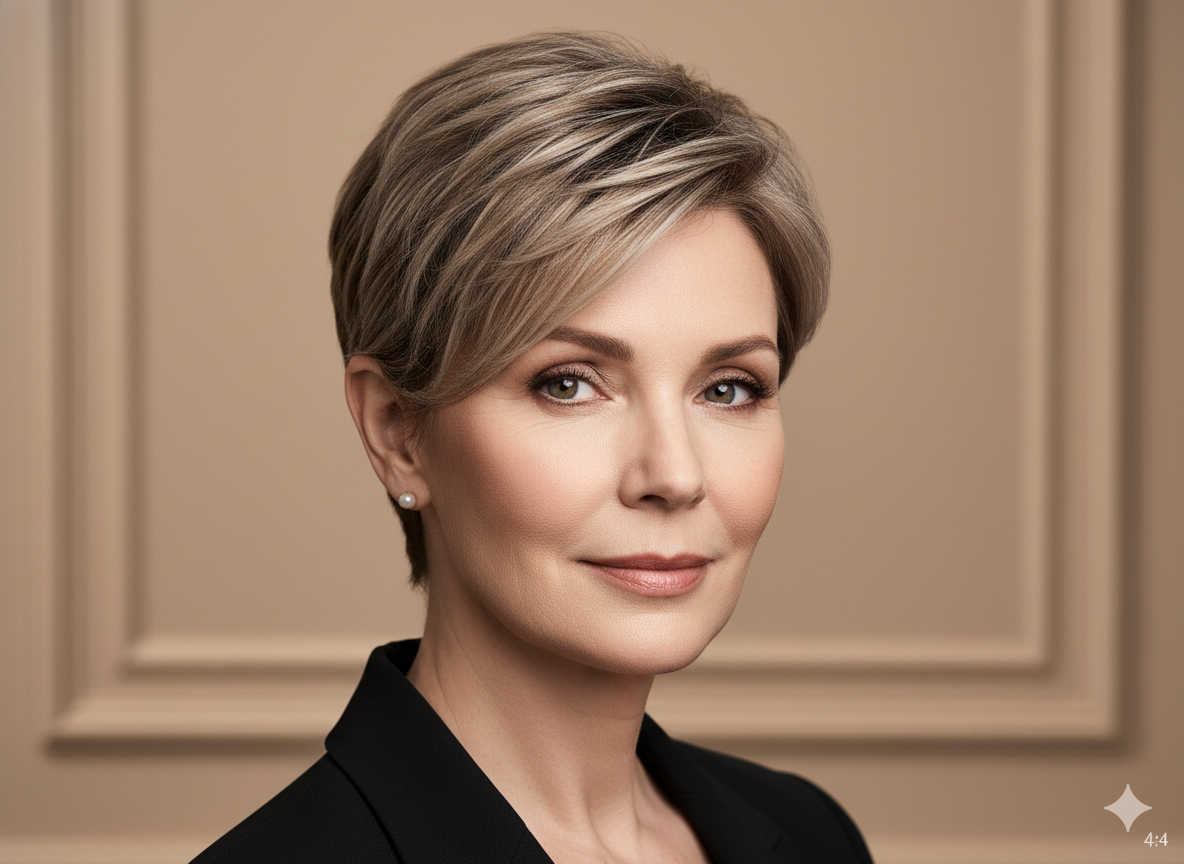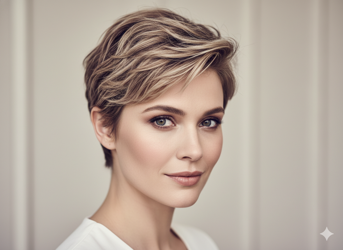 For a bold yet elegant look, a pixie cut with soft highlights adds dimension and makes styling effortless.