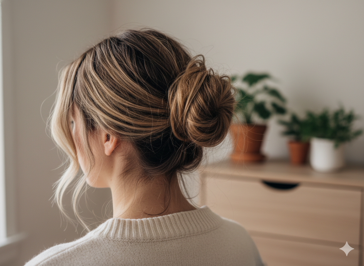 A casual messy bun with subtle highlights looks effortless yet chic for everyday wear.