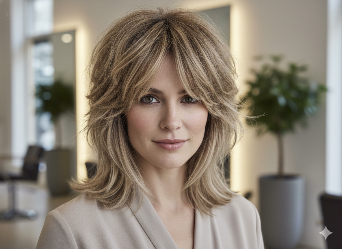 Feathered hairstyles bring softness around the face. Adding highlights enhances the airy texture beautifully