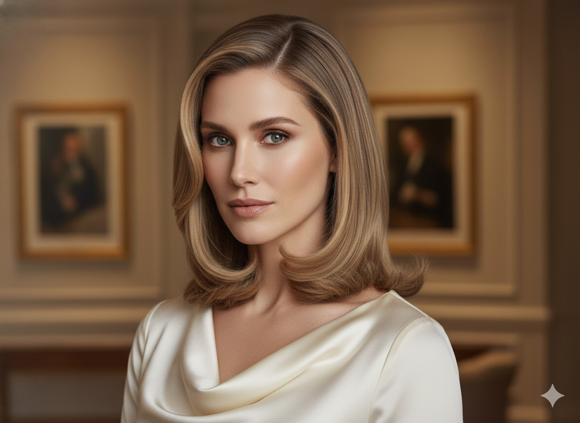 A deep side part combined with soft highlights creates a flattering, face-framing effect.