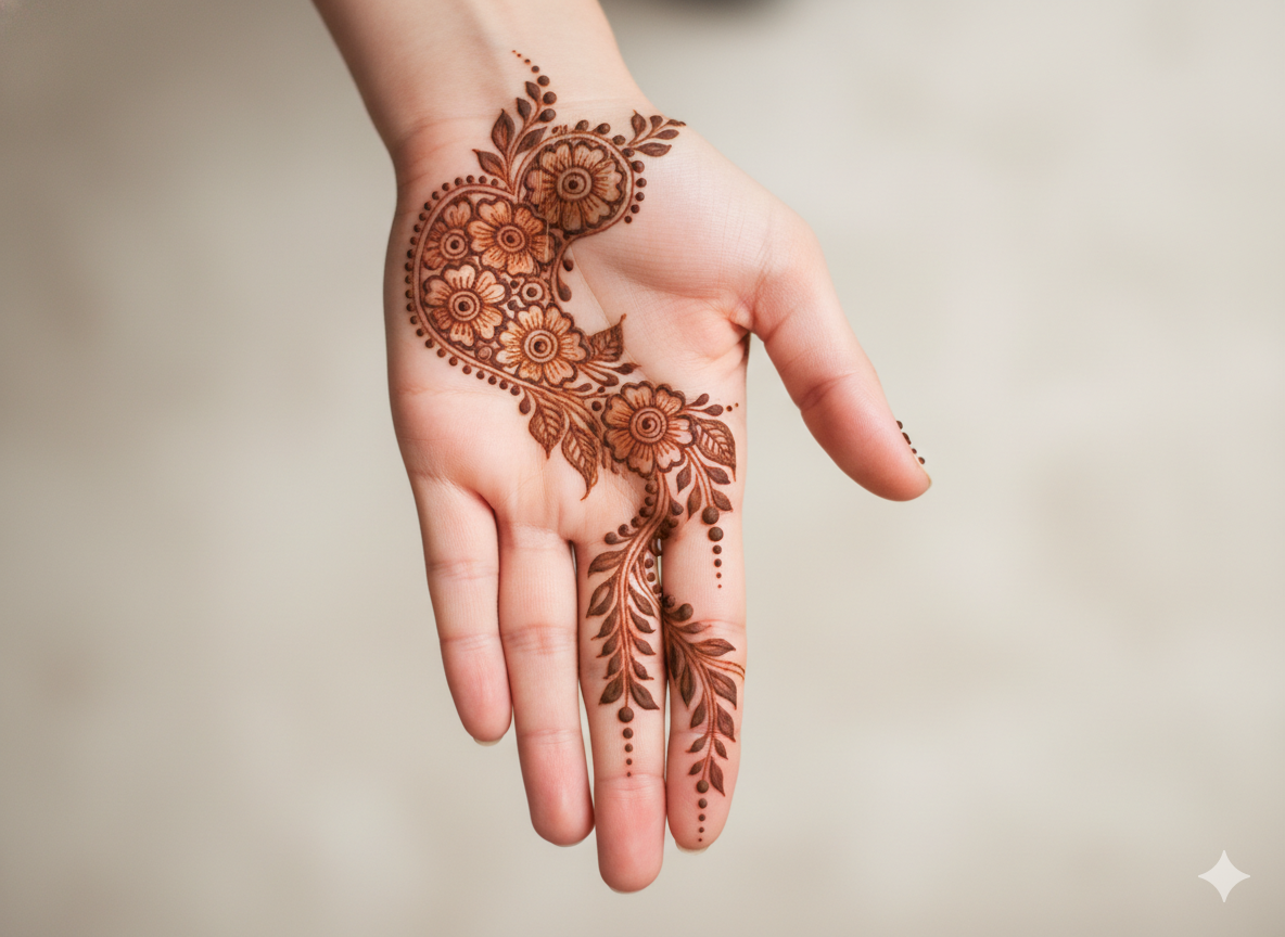 A half heart design with cascading flowers is an innovative way to blend modern trends with traditional artistry. Unlike full heart designs, this pattern uses one side of the heart as the base and lets flowers flow naturally down the palm.