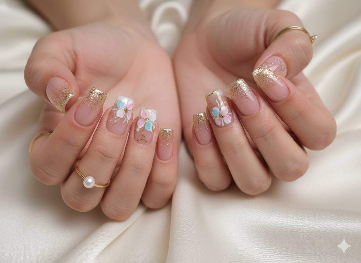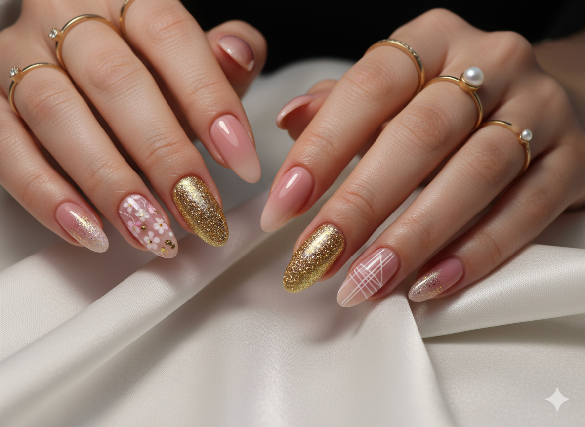 Blend nude tones into gold glitter for a gradient effect, finished with soft floral accents.