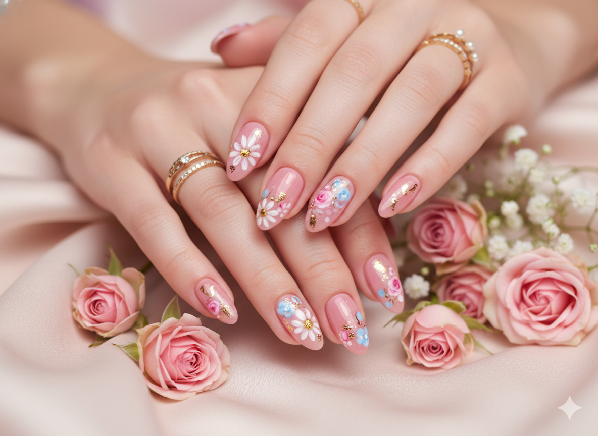 One of the biggest advantages of nude nails is their adaptability. They work seamlessly with any outfit—casual, formal, or festive. Nude tones also create a clean and polished appearance, making them ideal for professional settings. When combined with intricate details like gold glitter and floral patterns, nude nails transform into a luxurious canvas of artistry.