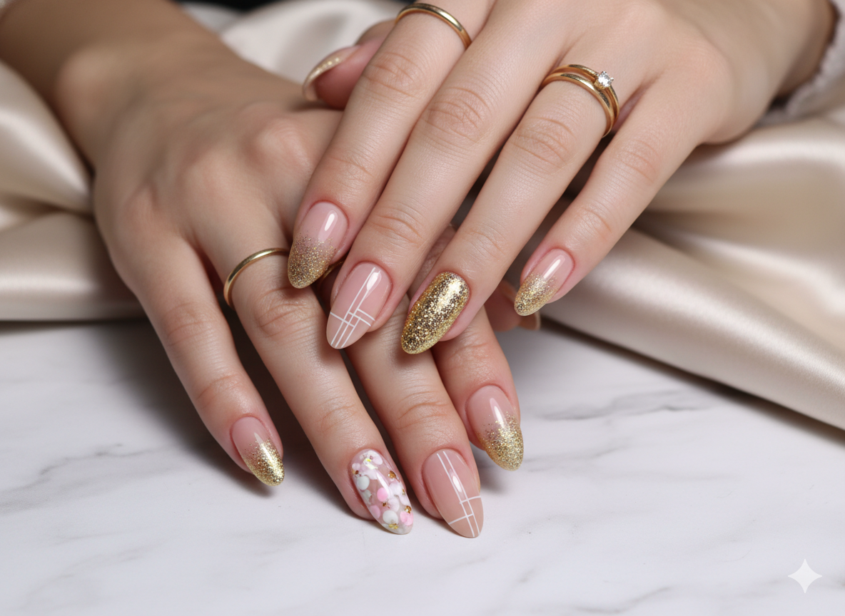 Floral nail art adds a romantic and delicate element to any manicure. When paired with nude tones and gold glitter, floral designs create a harmonious blend of softness and glamour.