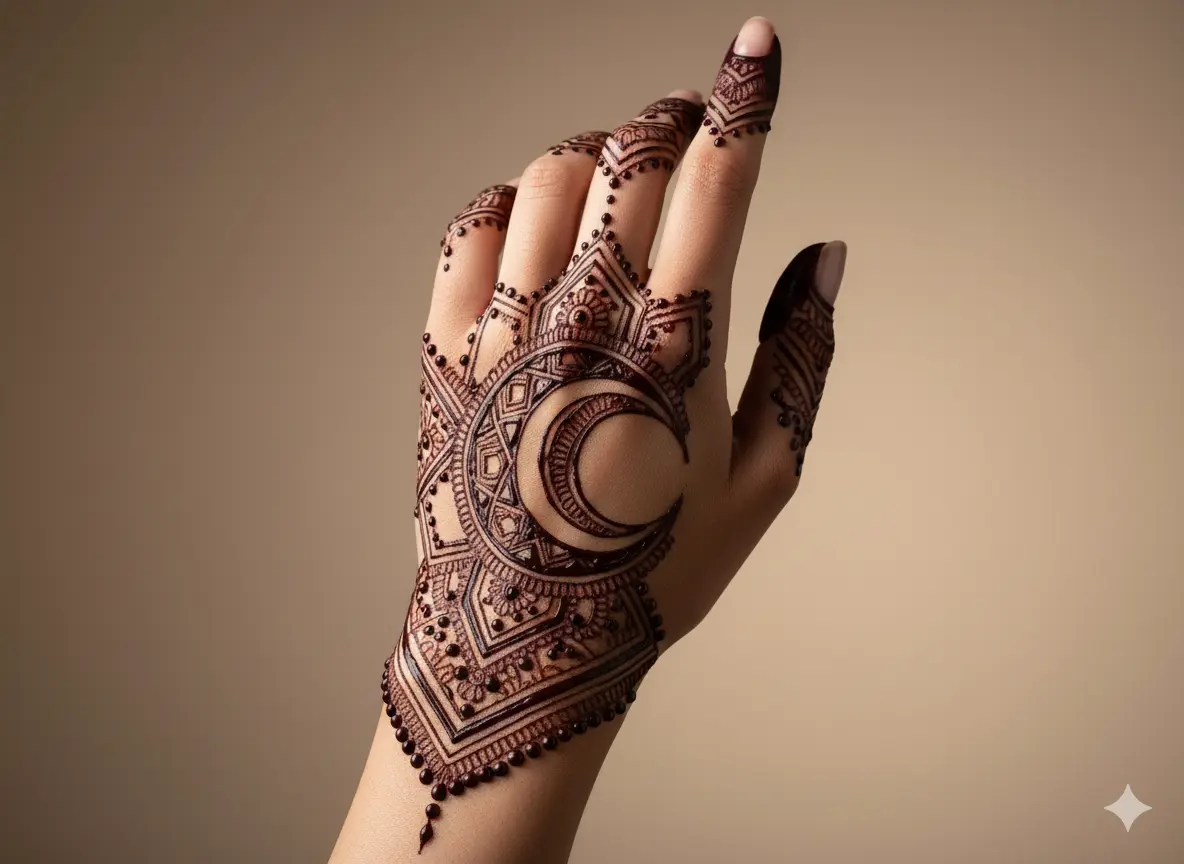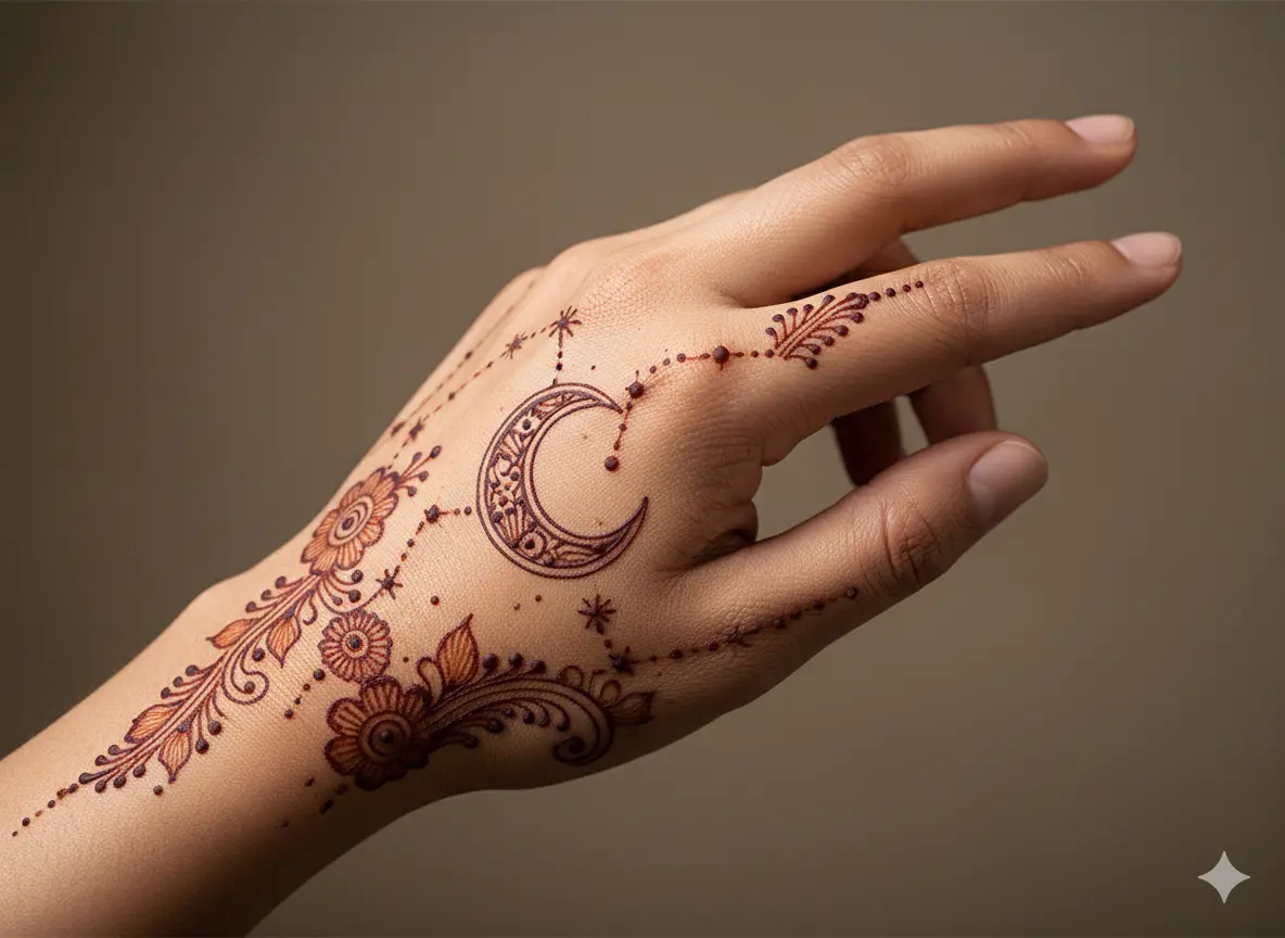 Using a fine-tipped mehndi cone allows artists to draw detailed moon shapes, delicate stars, and intricate floral accents around the crescent motif.
