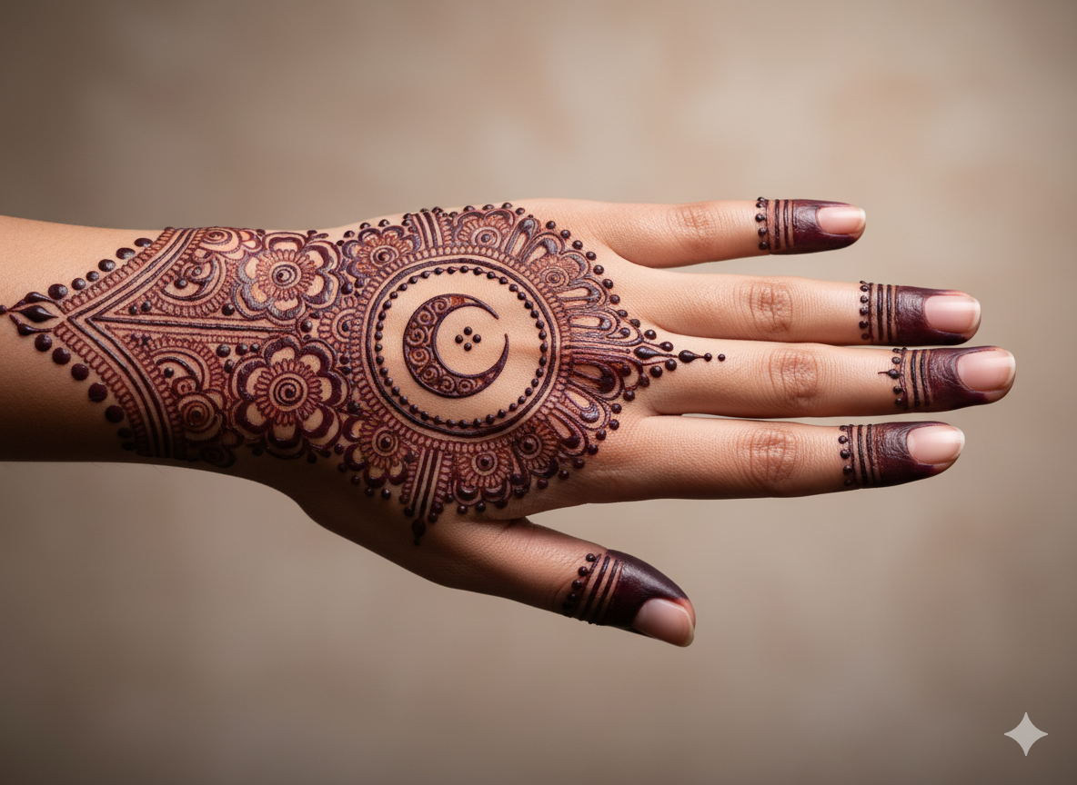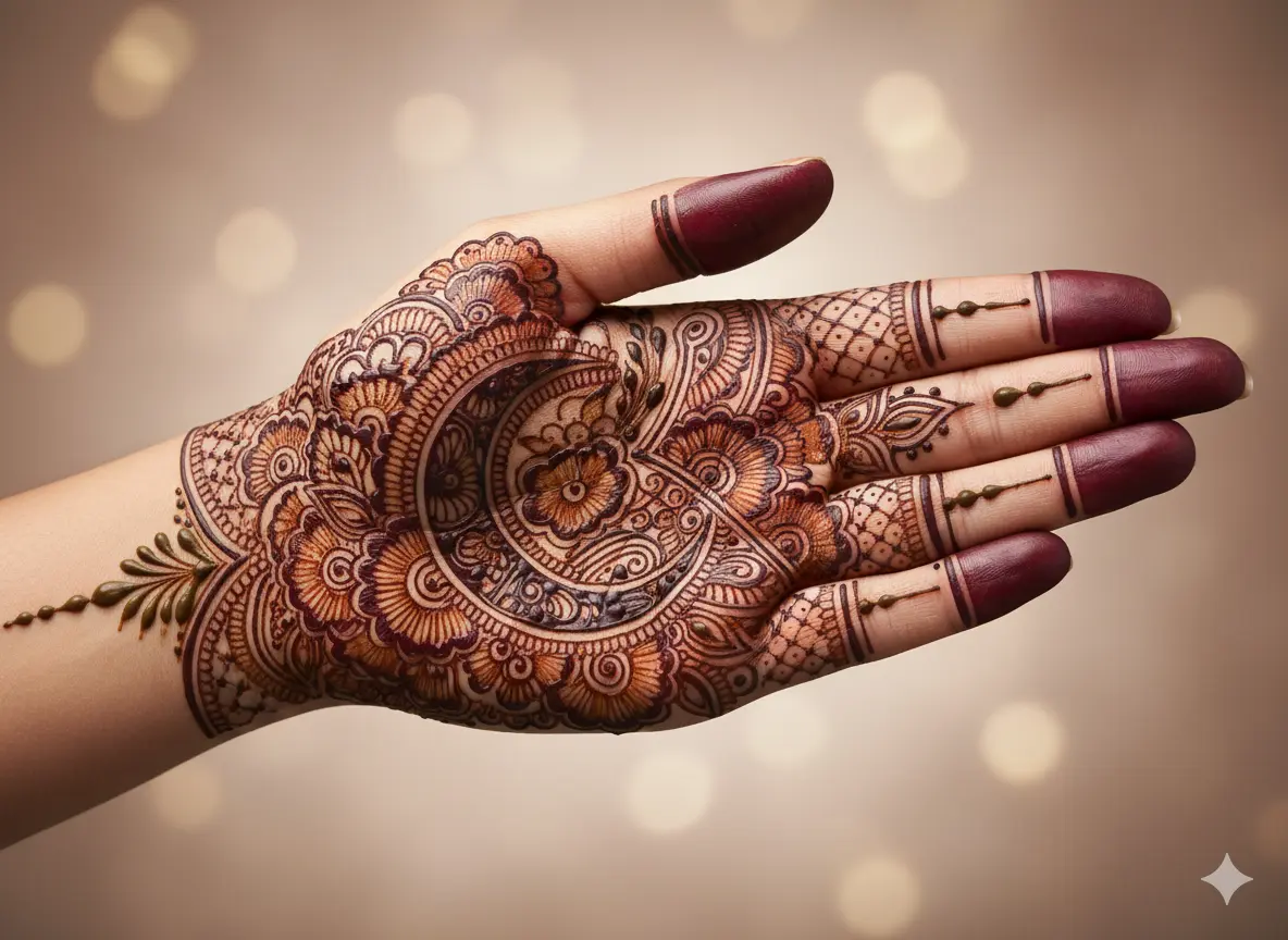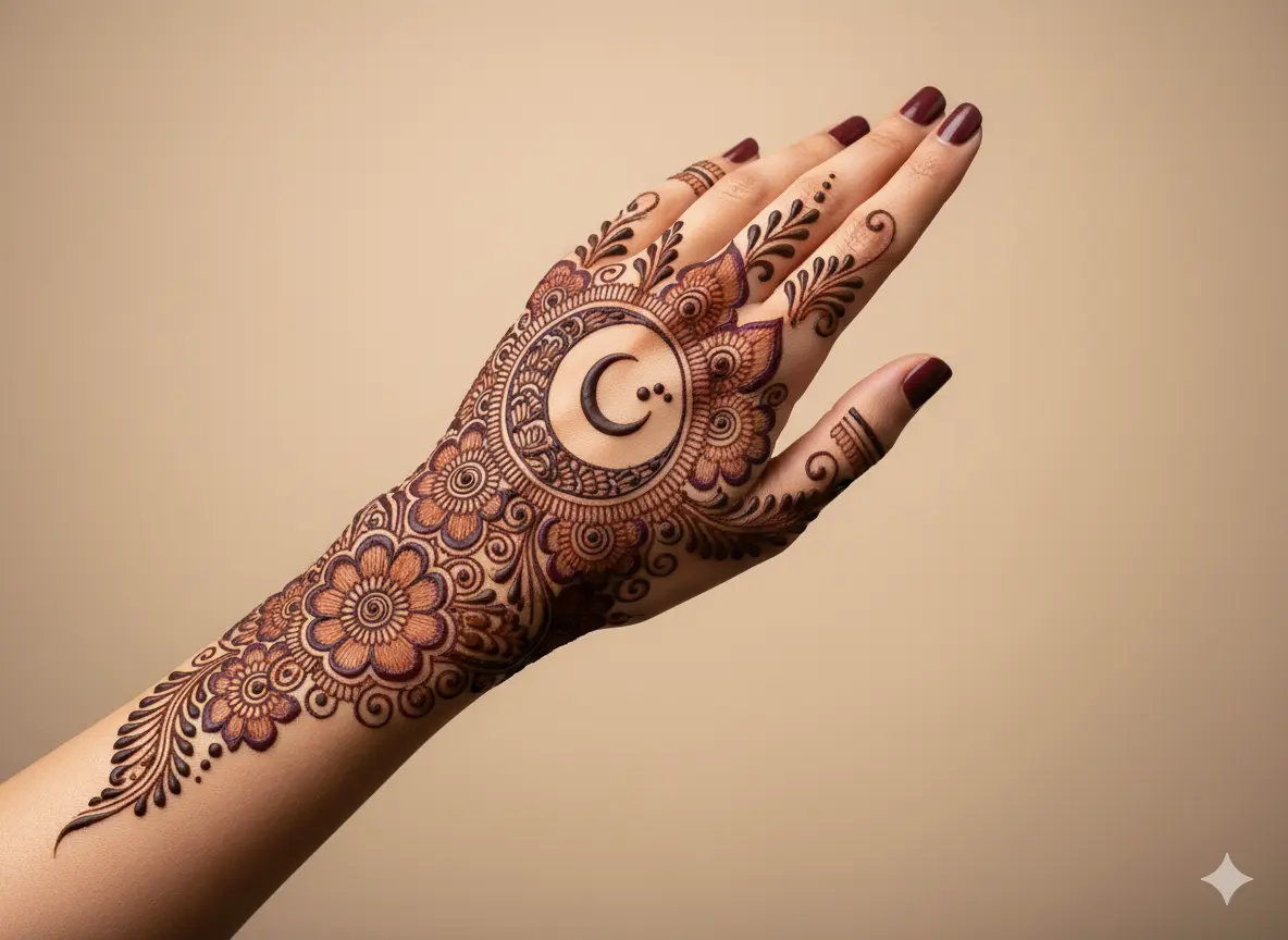 Some 2026 designs use gradient henna shades, from dark brown to light orange, to highlight the moon motif. This adds dimension and a glowing effect to the mehndi.