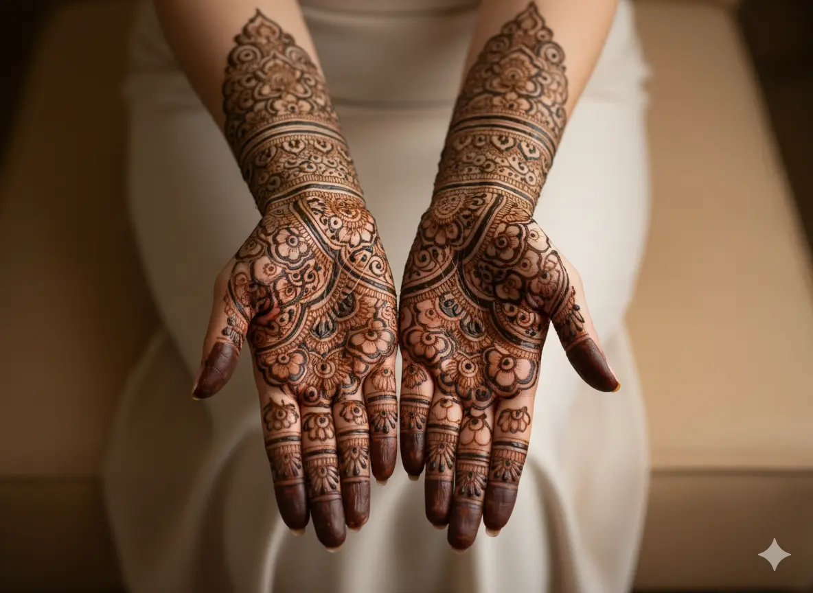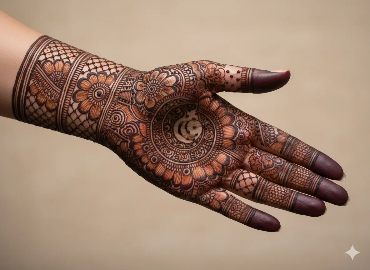Full-hand bridal mehndi remains timeless, but in 2026, artists are creatively incorporating crescent moons into the main motifs. These can be surrounded by paisleys, floral elements, or intricate lace patterns to create a sophisticated and luxurious look.