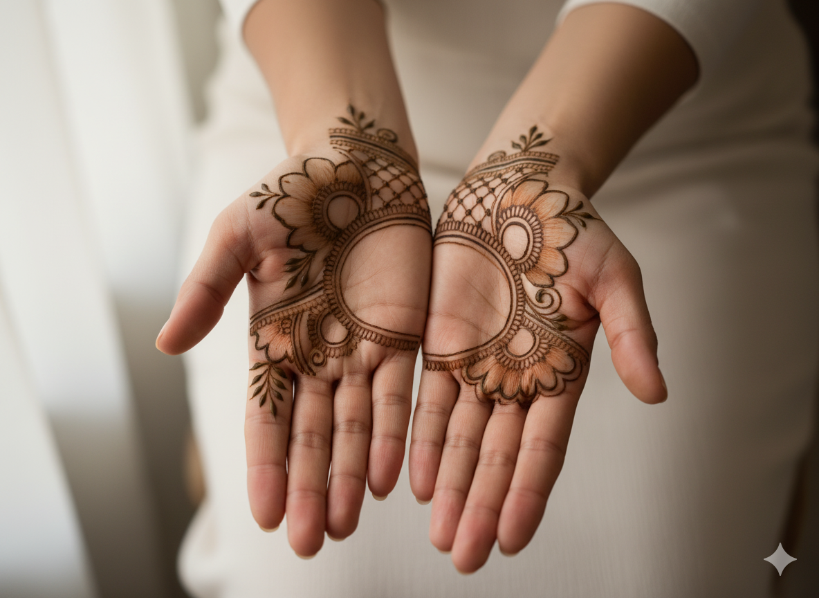 Unlike full-hand bridal designs, side moon mehndi can be placed on palms, wrists, forearms, or even shoulders, allowing for more creative expression and personalization.