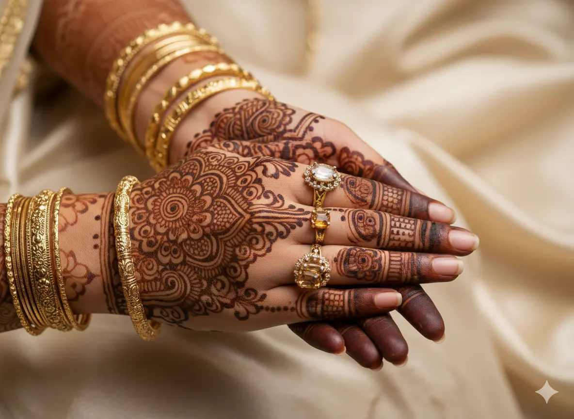 - Gold or White Henna: Often used for pre-wedding photoshoots or fusion weddings, especially on brides with darker skin tones.