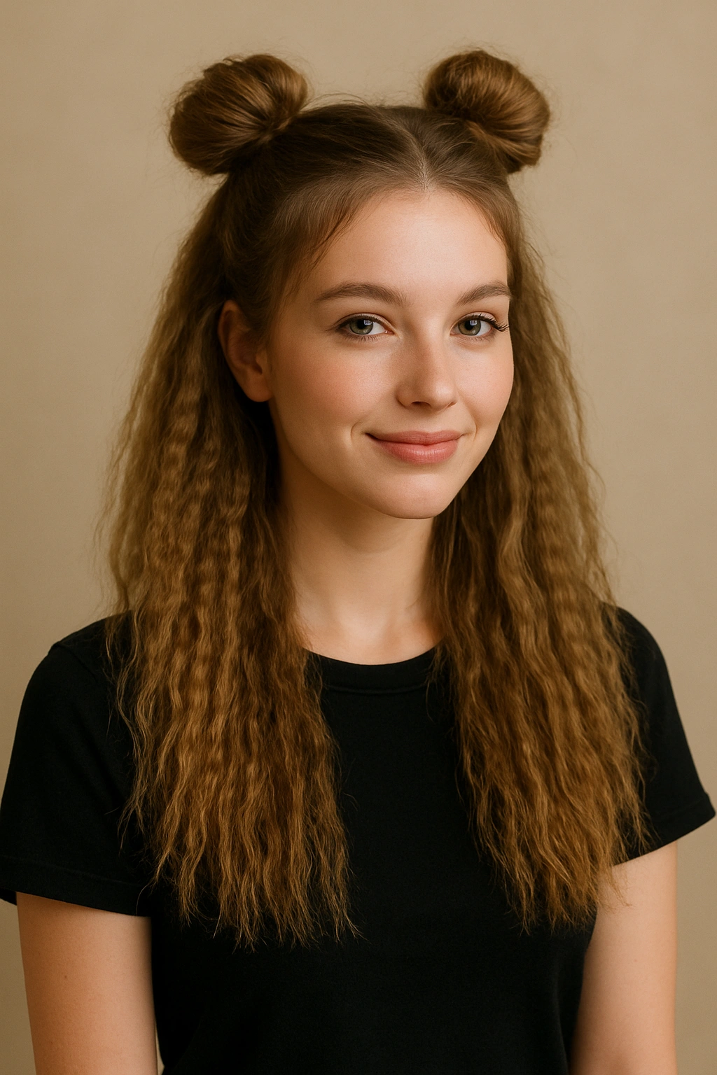For a playful and youthful look, try pairing a crimped hairstyles with half-up space buns. Crimp your hair fully for volume, then create two buns on the top while leaving the rest flowing. The crimps give added thickness, making the buns look fuller and more dramatic. This quirky style is perfect for concerts, festivals, or themed parties, adding fun energy to your overall look while still being easy to achieve.