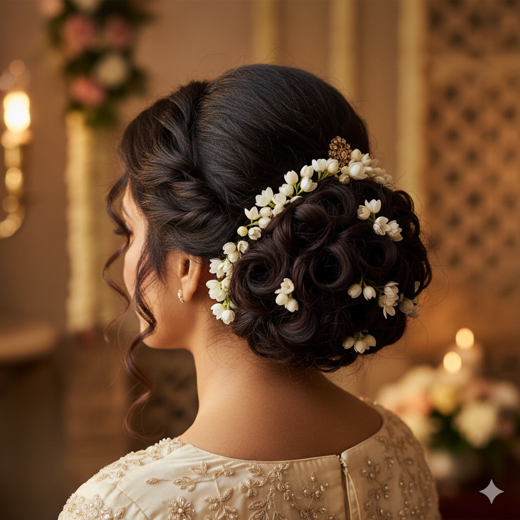 Jasmine flowers are associated with purity and grace, making them a perfect choice for brides. A curly bun with flowers like jasmine creates a traditional yet regal look. Their delicate white petals add contrast to curls, while the fragrance enhances the overall bridal aura. This curly bun with flowers is popular in cultural weddings and works beautifully for evening ceremonies. The lightweight blossoms ensure comfort, while their symbolic meaning makes the hairstyle deeply meaningful and timeless.