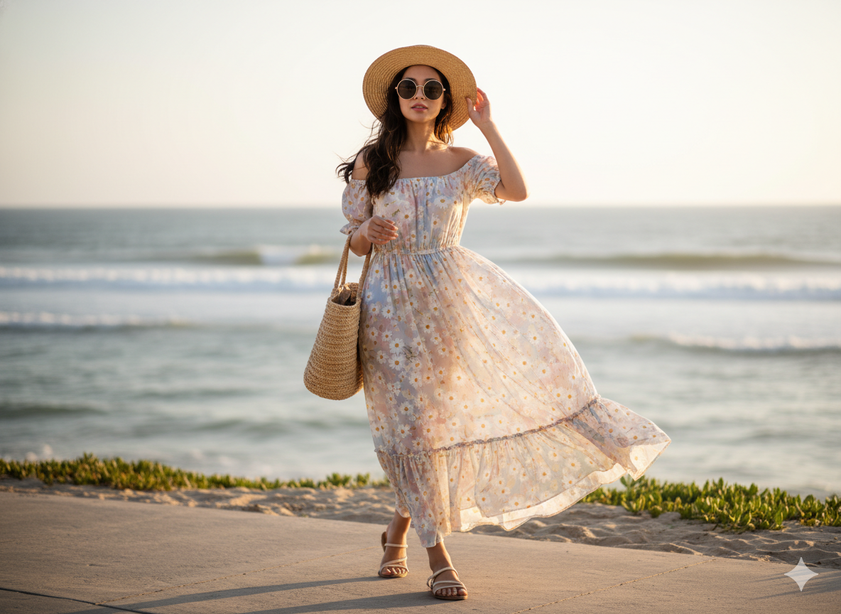 Nothing says vacation like breezy fabrics and floral prints. A lightweight off-shoulder maxi dress with daisy patterns is perfect for beach walks or sunset dinners.