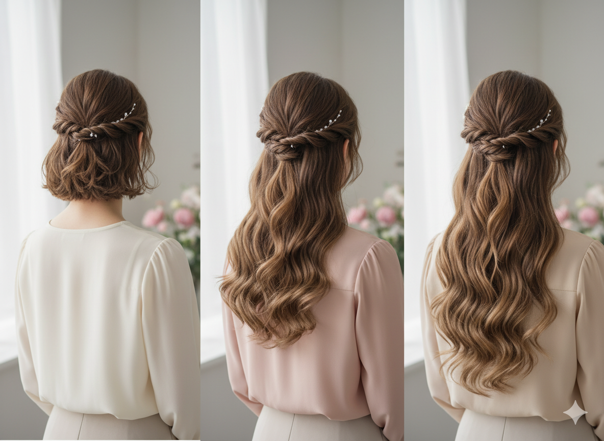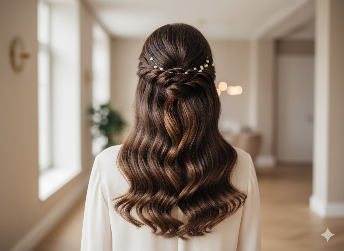 The hairstyle follows a half-up styling technique, where the upper portion of the hair is gently secured while the remaining hair flows freely. This method provides both structure and freedom to the hair design.