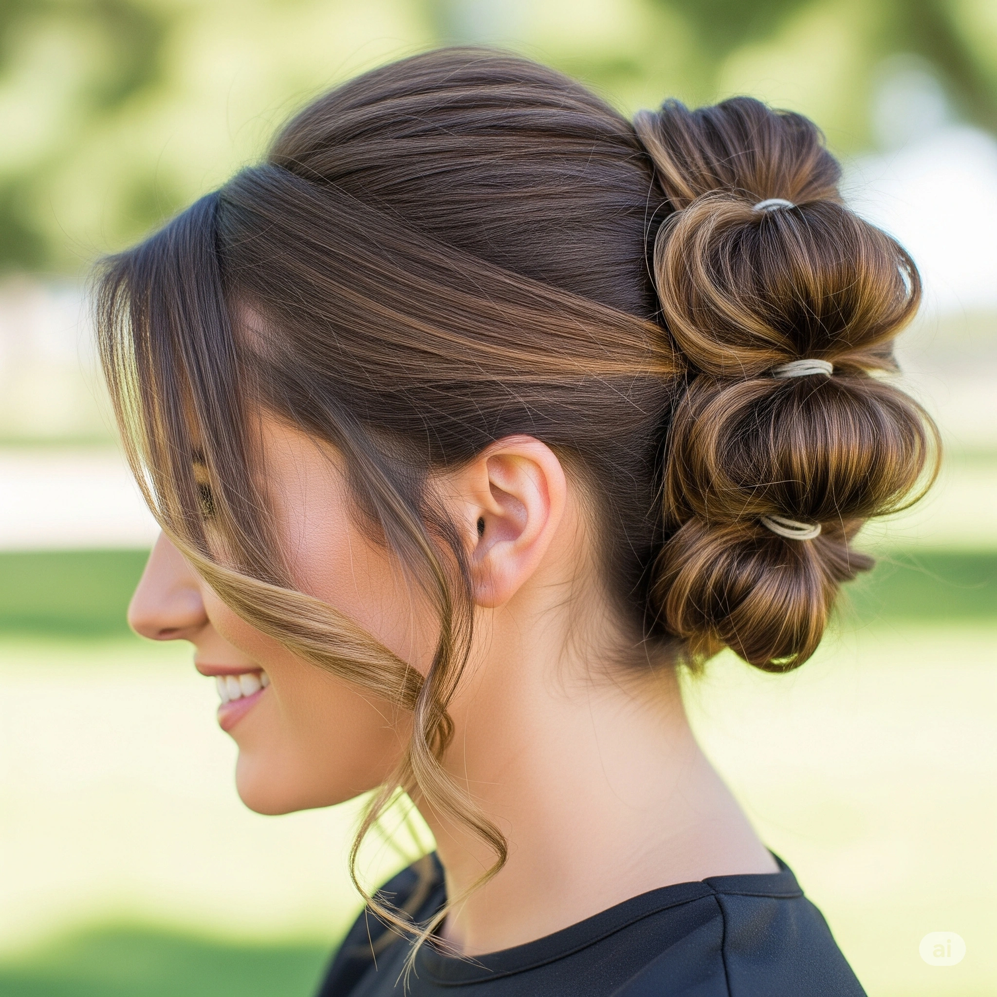 Create a fun, bubbly texture by dividing a ponytail into sections with hair ties before forming the bun. This whimsical style is great for teens, parties, or playful photo shoots. It’s eye-catching and full of personality.