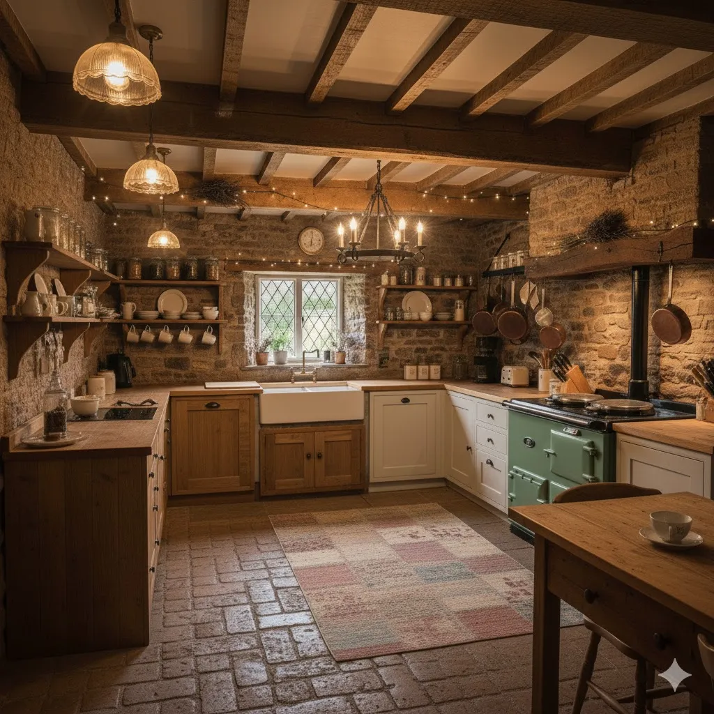 Lighting plays a big role in setting the mood. Soft, warm lights make the kitchen feel inviting and cozy. Choose vintage-style pendant lights, old lanterns, or even chandeliers with a rustic finish. A mix of task lighting and soft glow gives your kitchen both function and beauty. Brass, copper, or iron finishes work especially well in cottage-inspired spaces.