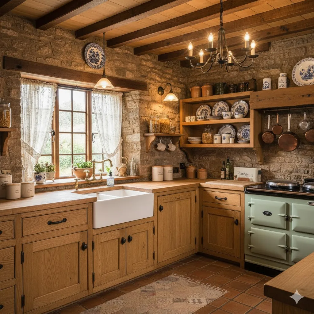 A traditional Aga or range cooker is the centerpiece of many English country kitchens. These big cookers aren’t just beautiful — they bring warmth and comfort, literally. Their solid build and vintage design fit perfectly in the cottage aesthetic. Even if you can’t get a real Aga, modern replicas or pastel-colored ovens can create a similar focal point.