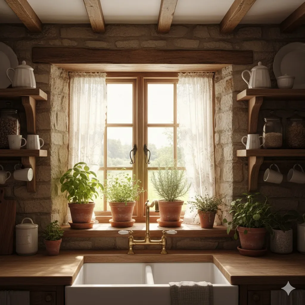 No English cottage kitchen is complete without some greenery. Fresh herbs like rosemary, basil, and thyme in small pots add life and fragrance to the space. You can place them on windowsills, shelves, or hanging baskets. Besides being decorative, they’re practical too — perfect for adding flavor to your dishes while brightening your kitchen naturally.