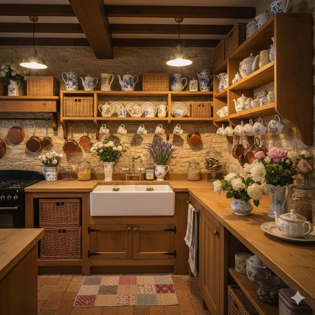It’s the small details that bring everything together. Cottage-style accessories like ceramic pitchers, wicker baskets, and old teapots make your space feel cozy and personal. Hang a few copper pans, display old cookbooks, or add a vase of wildflowers. Every piece tells a story, making your kitchen not just beautiful but also full of heart.