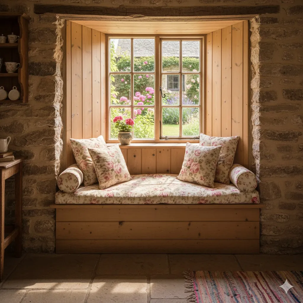 Window seats are one of the most beloved features of cottage homes. A sunny window with a soft cushion and a few pillows creates the perfect place to relax, read, or sip tea. You can also use the space under the seat for storage. It’s a great way to make use of natural light and add both function and charm to your kitchen.