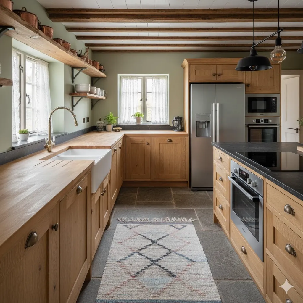 Nothing says “English cottage” like exposed wooden beams. They add warmth, texture, and authenticity to the space. Natural elements such as wood, stone, and clay connect your kitchen to the outdoors, creating a cozy and organic feel. Even if your home doesn’t have real beams, you can use faux wood beams or rustic wooden shelves for a similar look. Pair them with stone counters or brick backsplashes for that old-world countryside magic.