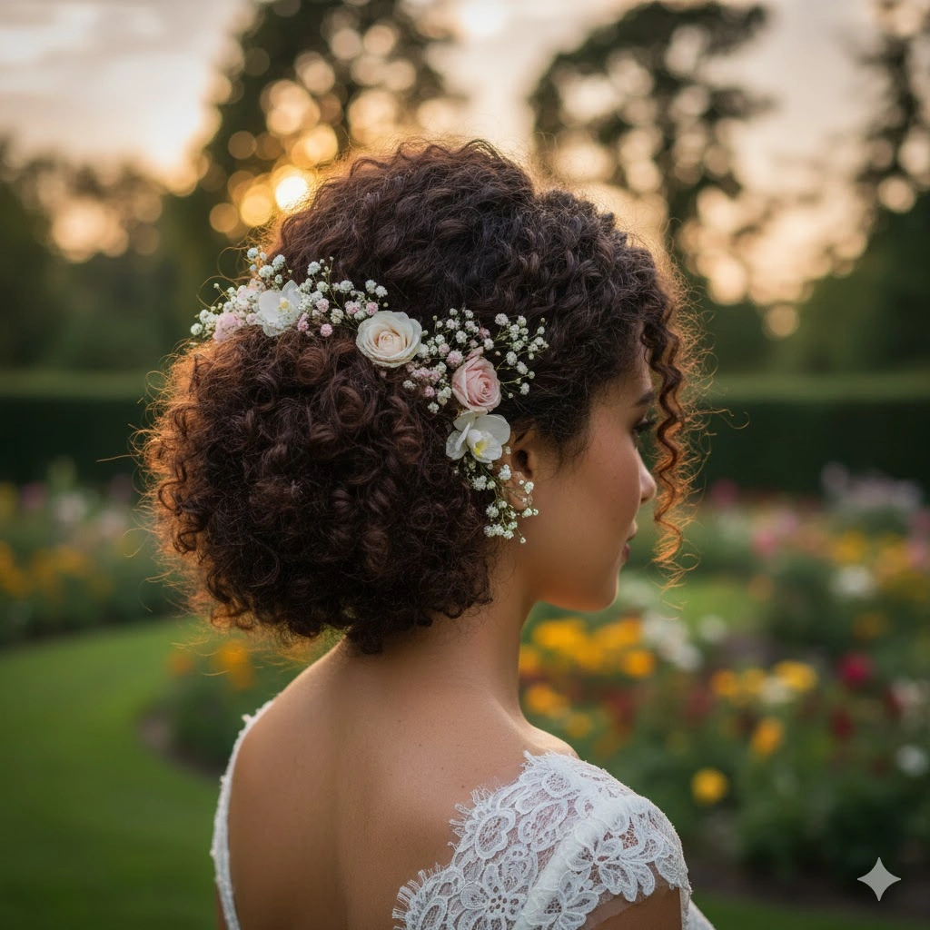 For curly-haired beauties, an updo with tiny floral pins adds delicate detail without overpowering your curls. This hairstyle enhances natural volume while keeping the look neat and sophisticated. It works well for formal occasions and flatters every skin tone. Choose light-colored flowers for dark hair or vibrant blooms for lighter shades. The keyword curly updo with flower headpiece embodies balance — letting your curls shine while adding floral magic to complete your look.